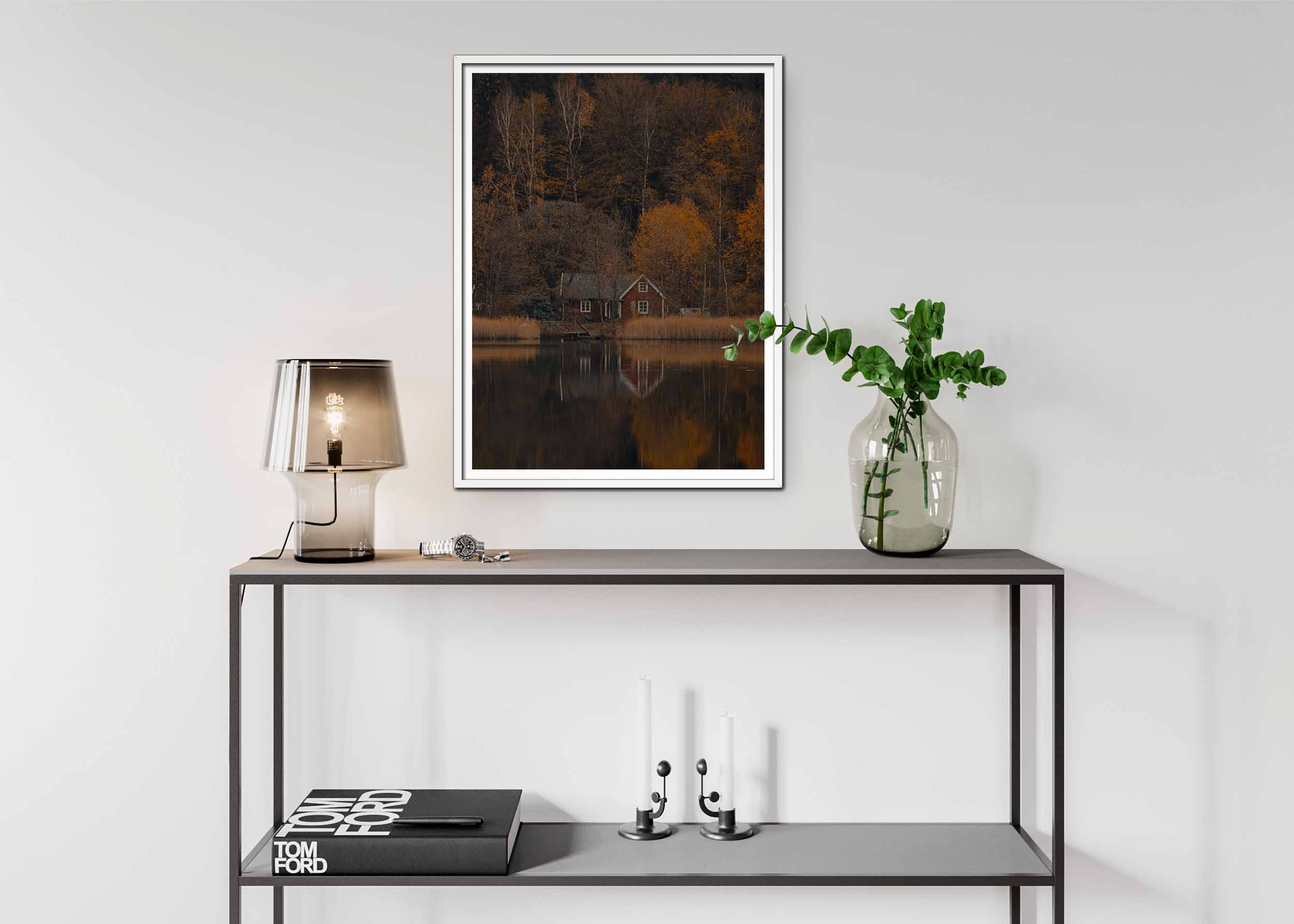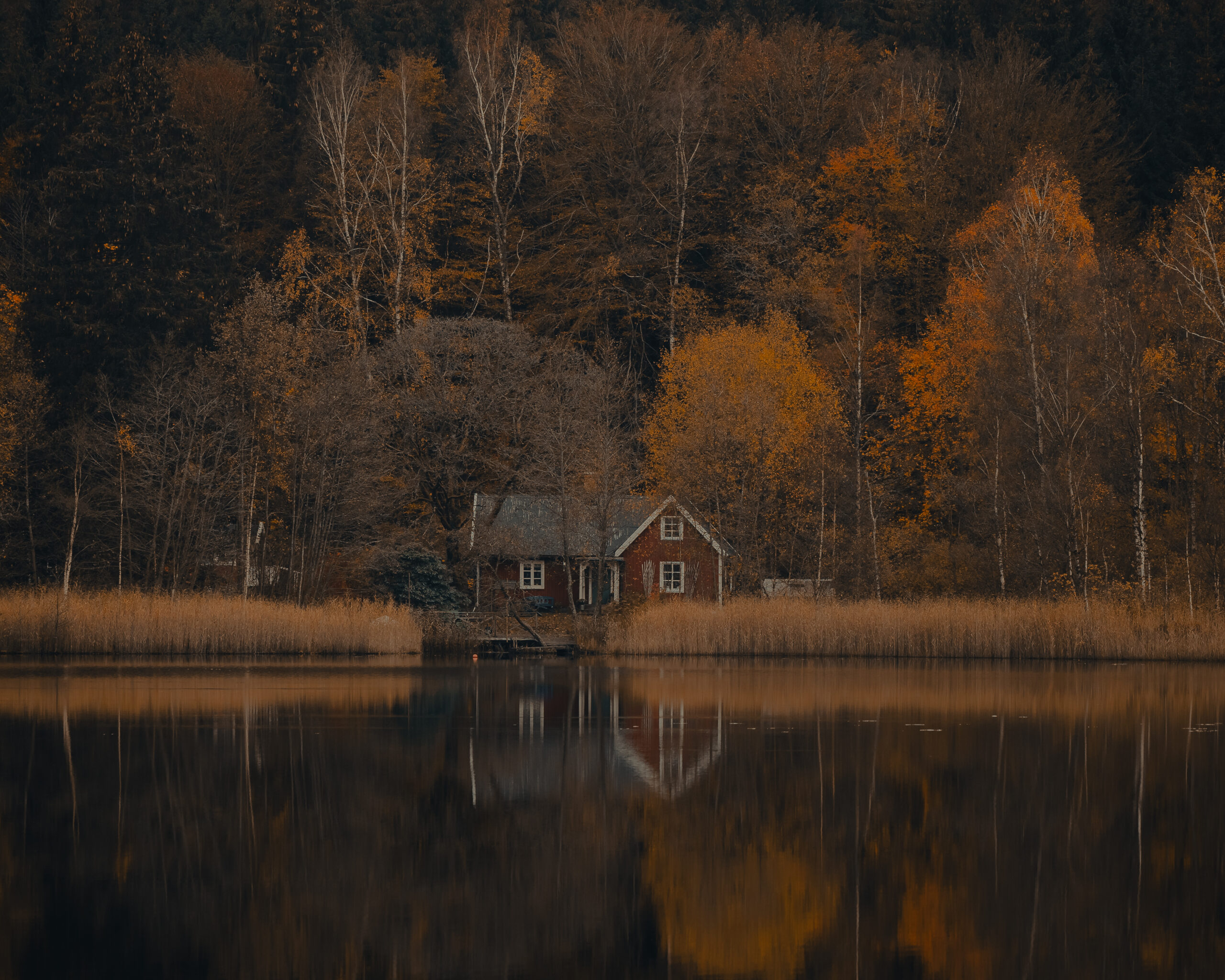 Bilden fångar en stillsam höstdag vid en sjö. I förgrunden breder ett fält av höga vassruggar ut sig, deras bruna stjälkar vajande lätt i vinden. Bortom vassruggarna skymtar en röd stuga med vita knutar, placerad vid strandkanten. Stugan har ett snedtak och små fönster, vilket ger den en klassisk och hemtrevlig känsla. Bakom stugan reser sig en skog med höga träd i varma höstfärger. Löven har antagit nyanser av gult, orange och rött, vilket skapar en vacker kontrast mot den mörkare gröna färgen på barrträden. Sjön ligger spegelblank och reflekterar färgerna från omgivningen, vilket skapar en lugn och harmonisk atmosfär.