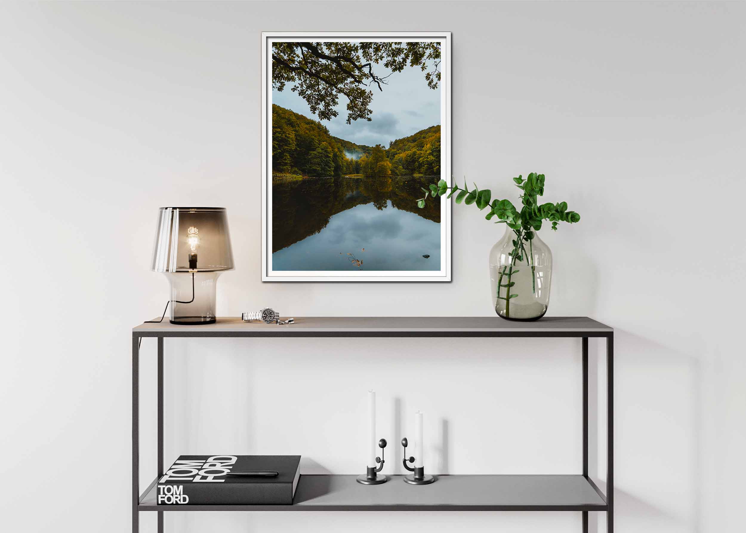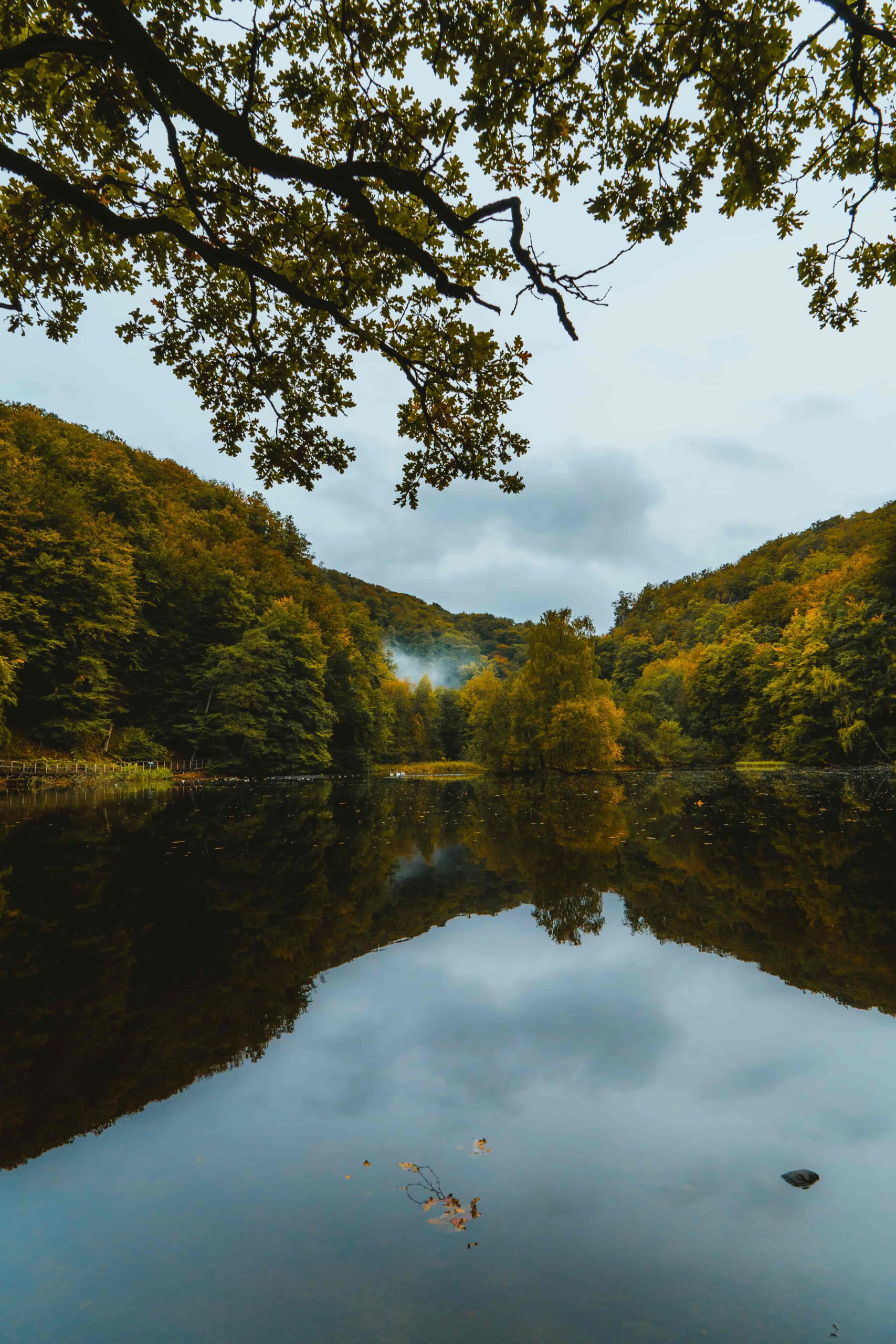 Ett lugnt, spegelblankt vatten reflekterar de täta, gröna träden som kantar dess sidor. Höstens gyllene toner blandas med de mörkgröna löven, vilket skapar en harmonisk färgpalett. Himlen är molntäckt, och det gråa skapar en subtil kontrast mot det färgstarka landskapet. I förgrunden sträcker sig en trädgren ut över sjön, vilket ger bilden ett inramande perspektiv. I bakgrunden syns ett lätt dimmoln som svävar mellan träden, vilket tillför en drömsk känsla till scenen. Detta är en stillsam plats som lockar till eftertanke och ro.