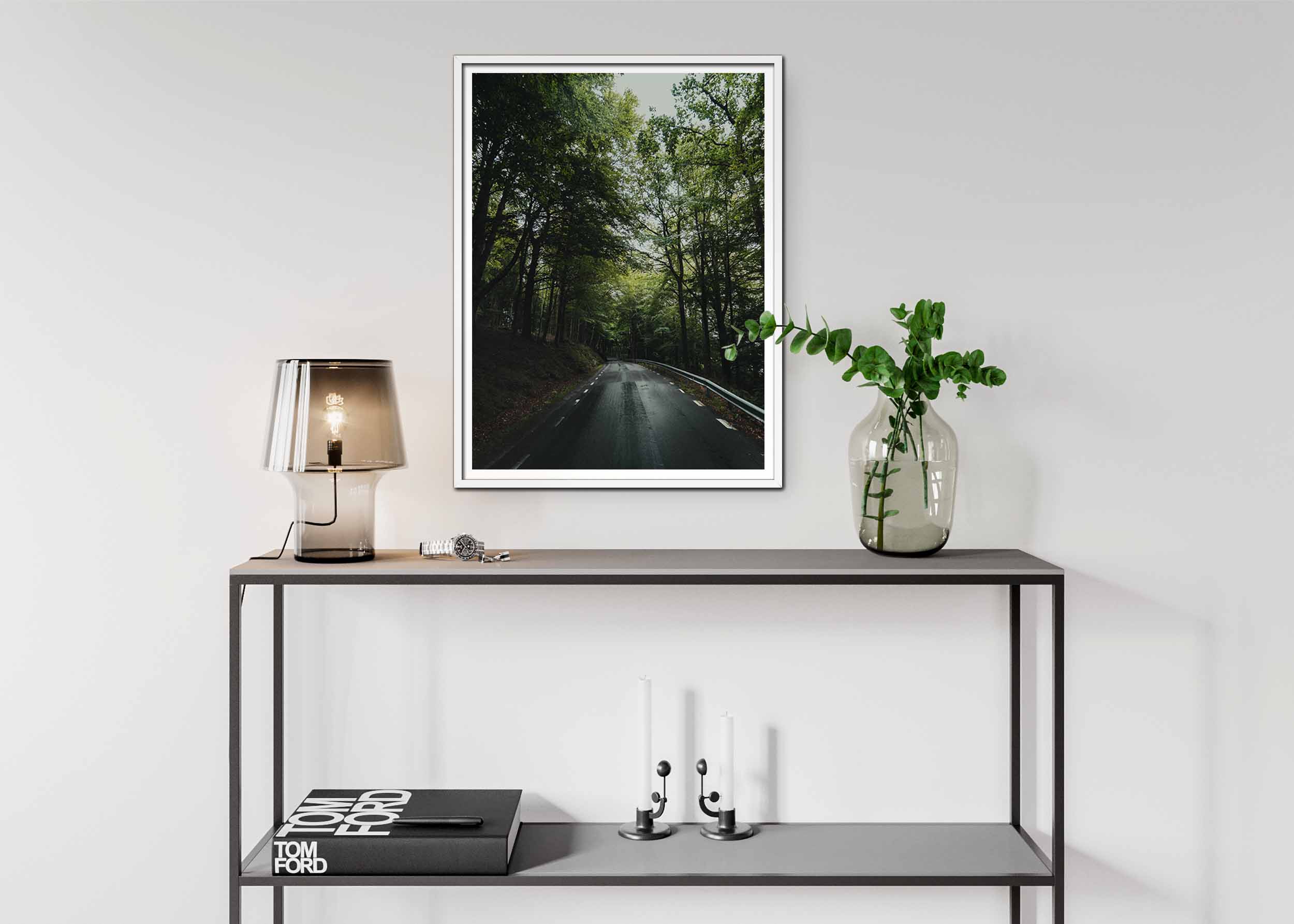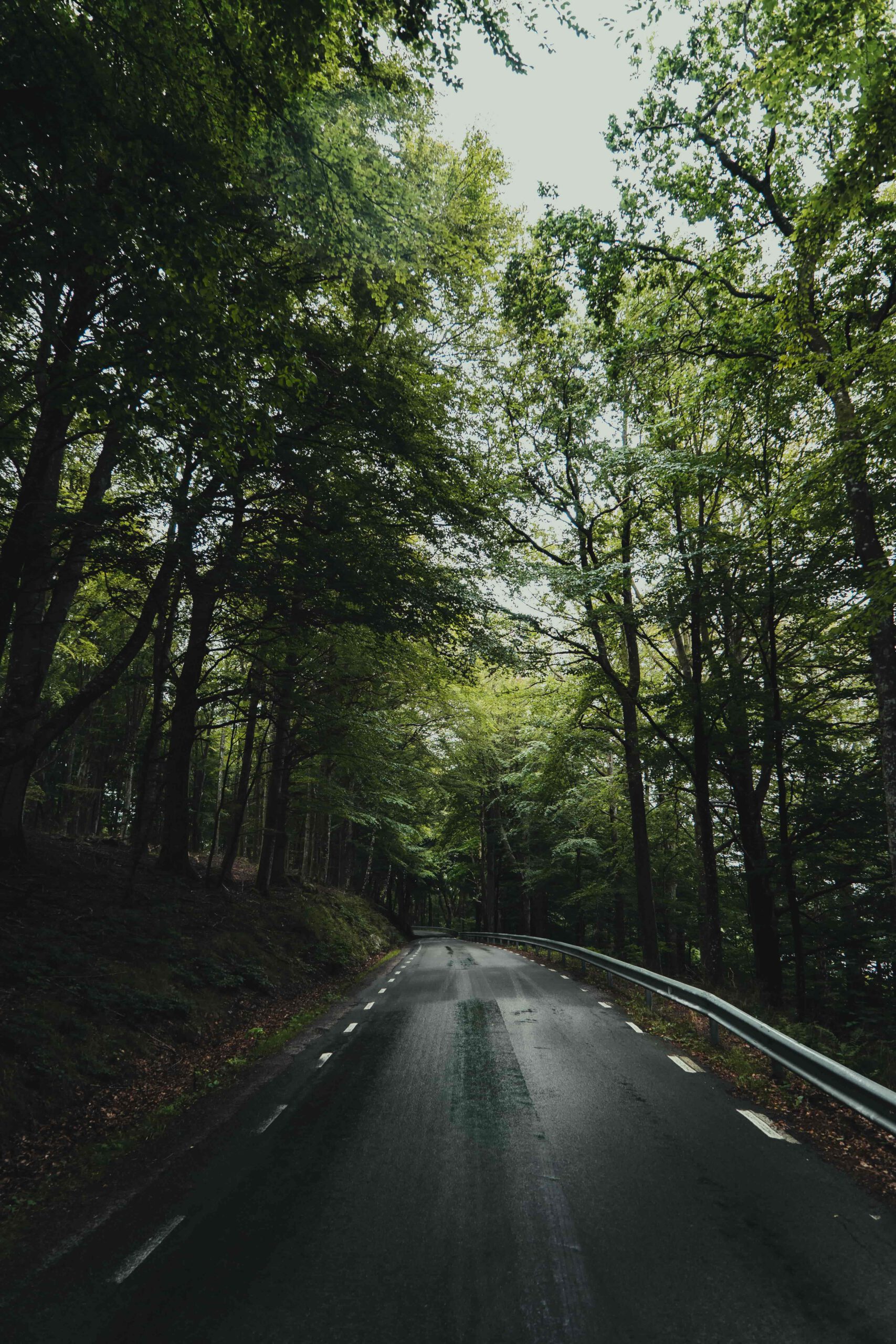 Bilden fångar en slingrande asfaltväg som skär genom en tät skog. Vägen är omgiven av höga träd med frodiga gröna blad som bildar en tunnel över vägen. Solens strålar tränger ned genom lövverket och skapar ett lekfullt skuggspel på den fuktiga asfalten. Längs vägkanten syns vita vägmarkeringar som ger en känsla av djup och perspektiv. Den omgivande skogen är mörk och lummig, vilket skapar en mystisk och inbjudande atmosfär. Bilden ger en känsla av lugn och ro, och inbjuder betraktaren att ta en promenad eller cykeltur längs vägen.