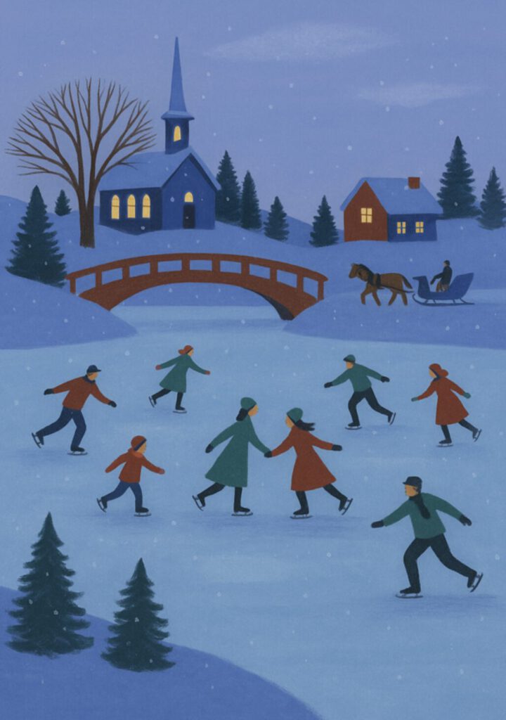 Skymningen lägger ett blått skimmer över en frusen vik där människor glider fram på skridskor i mjukt snöfall. Två vänner håller varandra i handen medan andra tar långa, lekfulla skär. I bakgrunden lyser fönstren i den lilla träkyrkan varmt, och en röd träbro spänner över isens smala öppning. En hästdragen släde passerar förbi en röd stuga med tända lampor, vilket förstärker den rofyllda, nordiska vinterkänslan. De dämpade akvarelltonerna i blått, granitgrönt och rostrött gör postern tidlös och harmonisk. Perfekt att hänga i vardagsrum, hall eller barnrum för att sprida vintrig glädje och lugn.
