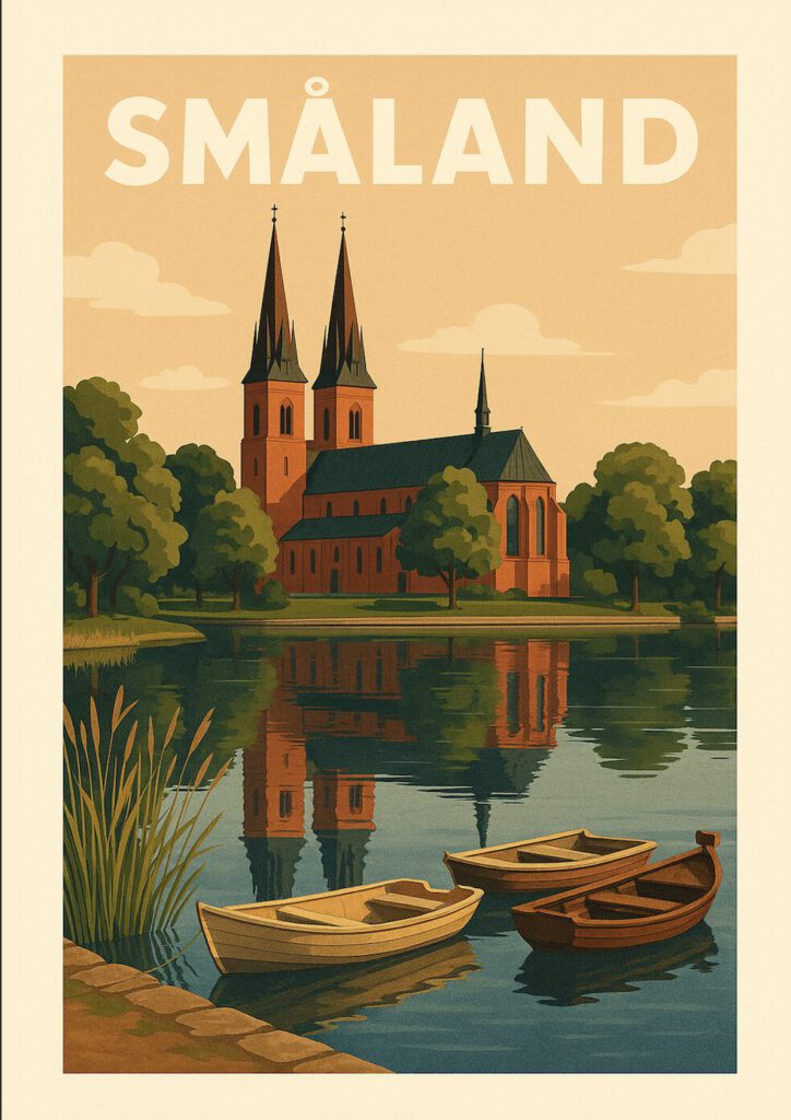 Denna poster hyllar Småland i en varm, retroinspirerad stil. I centrum står en tegelröd kyrka med höga spiror, vackert inramad av lummiga träd. Den speglar sig spegelblankt i sjön där tre små roddbåtar ligger förtöjda i förgrunden, bredvid vass och en stensatt kant. Den mjuka kvällshimlen i aprikos och blått ger motivet ett stilla, tidlöst skimmer. Den breda ljusa ramen och rubriken ”SMÅLAND” överst förstärker känslan av klassisk reseaffisch. Tavlan passar utmärkt i vardagsrum, hall, sovrum eller hemmakontor, där den tillför svensk naturromantik och nostalgisk resglans.