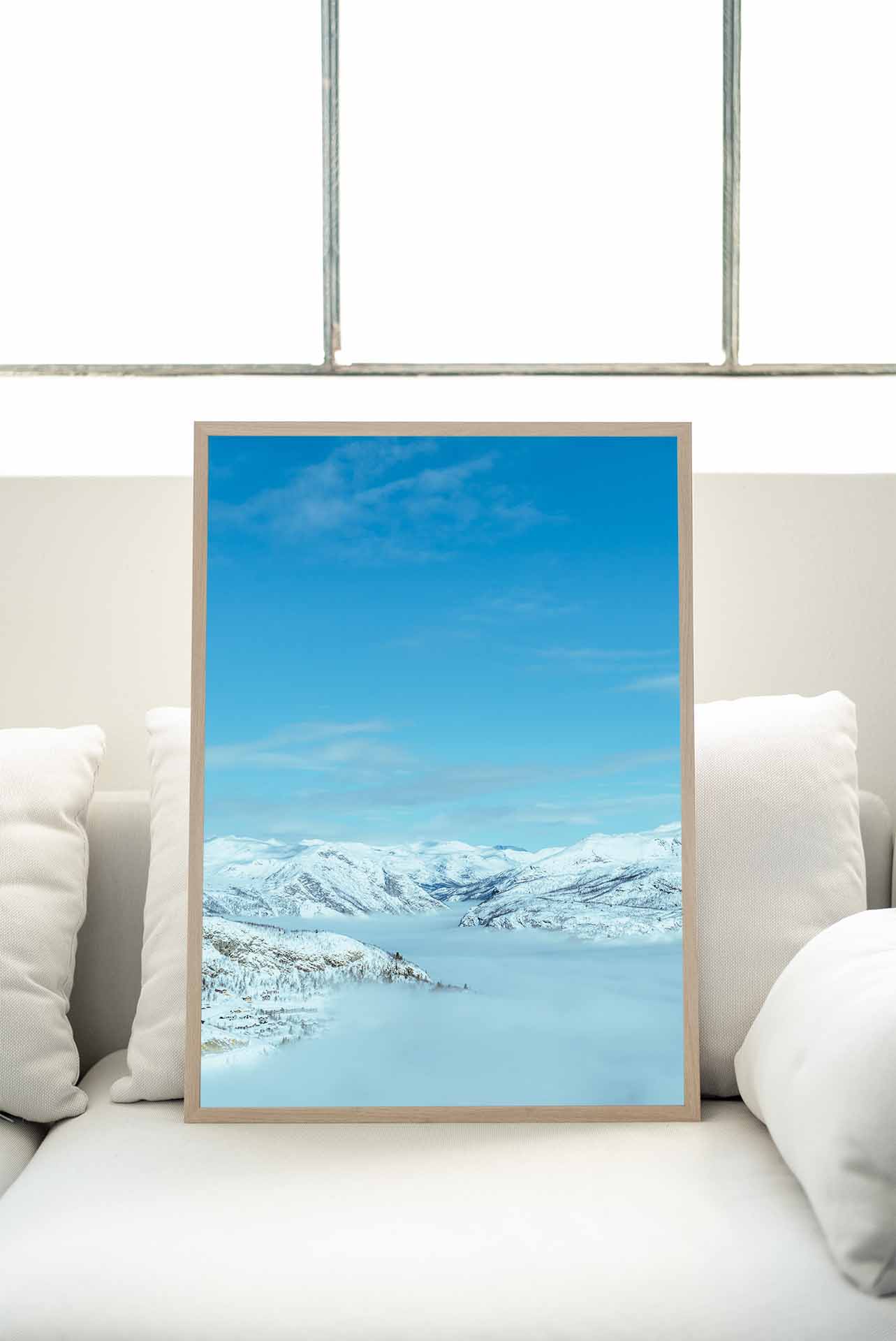 Bilden fångar ett magiskt ögonblick i ett vinterlandskap. I förgrunden breder en snöbeklädd slätt ut sig, där spår efter skidåkare eller snöskor vindlar sig som konstverk. I bakgrunden reser sig ett dramatiskt berglandskap mot en klarblå himmel. Topparna är täckta av ett tjockt lager snö som glittrar i solen. Mellan bergen ligger en dal som är dold i ett tjockt molntäcke, vilket skapar en mystisk och drömsk atmosfär. Det är som om man tittar ner på ett hav av moln, med bergen som öar som sticker upp ur dimman.