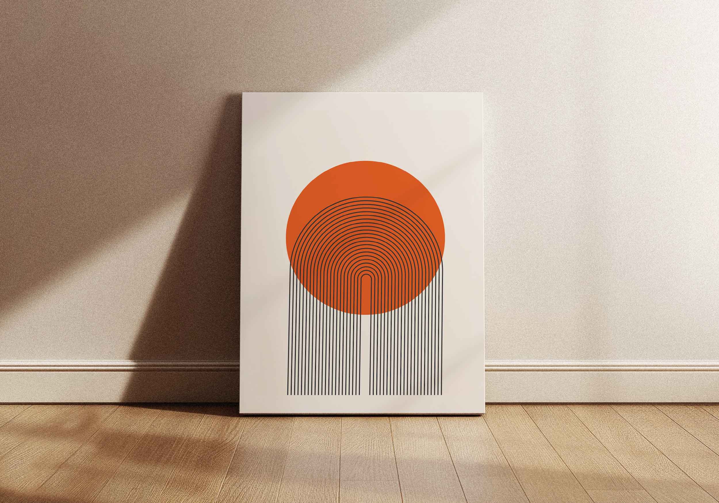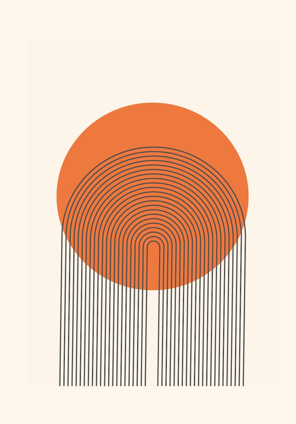 Bilden visar en minimalistisk och geometrisk abstrakt illustration mot en enfärgad, ljusbeige bakgrund. Centralt i bilden dominerar en stor, solid cirkel i en varm, dämpad orange-röd nyans. Från den nedre kanten av cirkeln sträcker sig parallella, tunna, mörkgrå linjer nedåt. Dessa linjer fortsätter under cirkeln och bildar i mitten en serie koncentriska, u-formade bågar som ligger tätt intill varandra, som en stiliserad solnedgång eller en regnbåge i omvänd form. Linjerna på sidorna av den centrala bågformationen fortsätter rakt nedåt som vertikala streck, vilket ger ett intryck av att solens strålar faller ner eller att det är en form av växtlighet som sträcker sig upp. Designen är ren och grafisk, med fokus på form, linjer och färgkontrast, vilket ger en modern och lugn känsla.