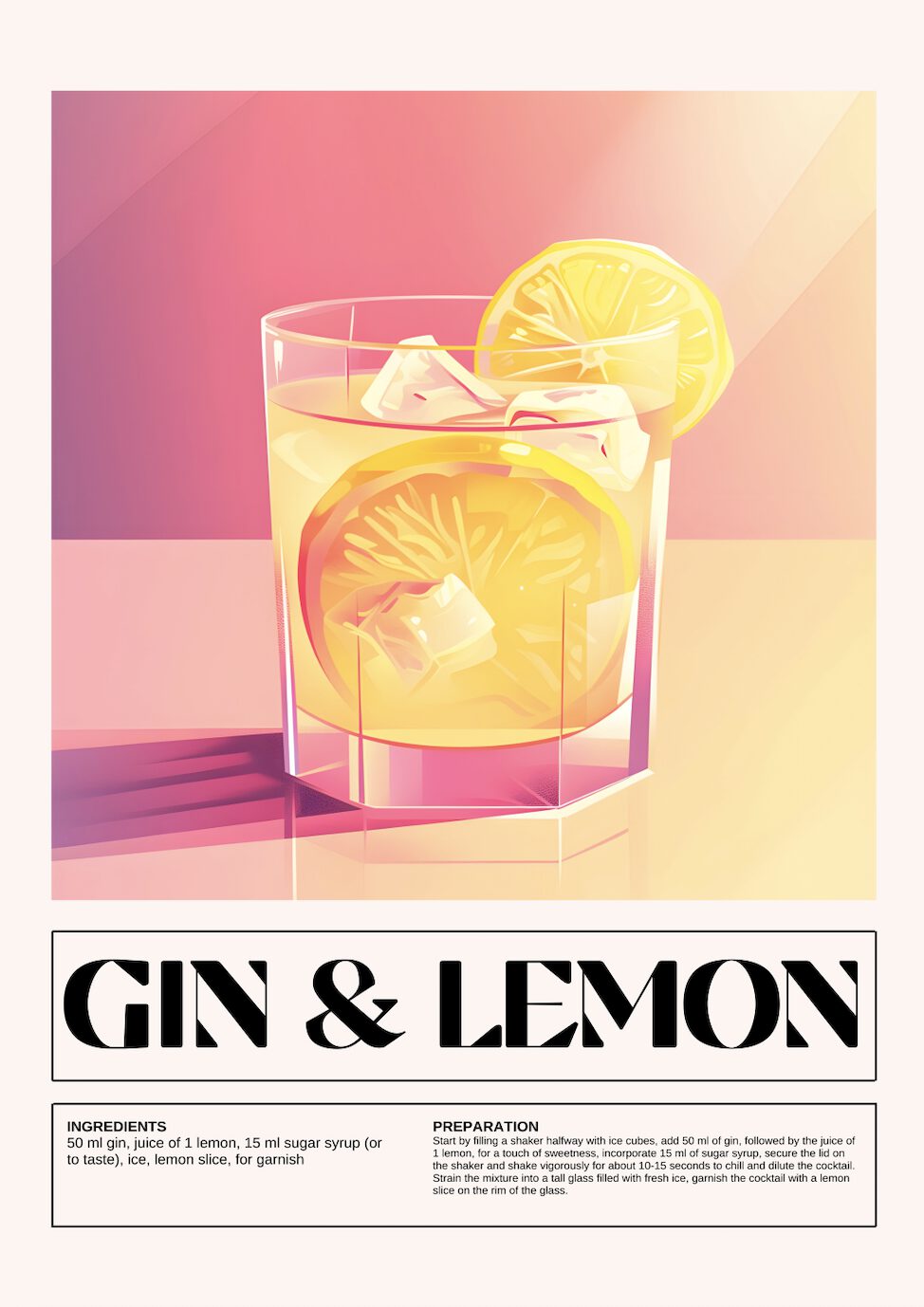 Bilden är en stiliserad poster som visar en cocktail i ett lowball-glas (whiskyglas), komplett med recept och instruktioner. Den övre delen av bilden domineras av en illustration av ett fyllt glas med en gyllene, gulaktig vätska, isbitar och en stor, rund citronskiva som vilar på glasets kant. Det finns även en citronskiva som ligger nedsänkt i drinken. Glaset är transparent med skarpa kanter och reflekterar ljus på ett sätt som ger det en glansig, nästan glasklar, look. Bakgrunden bakom glaset är en mjuk gradient som övergår från ljusrosa/lila upptill till en varmare orange-gul färg nertill, vilket skapar en lugn och inbjudande atmosfär.
