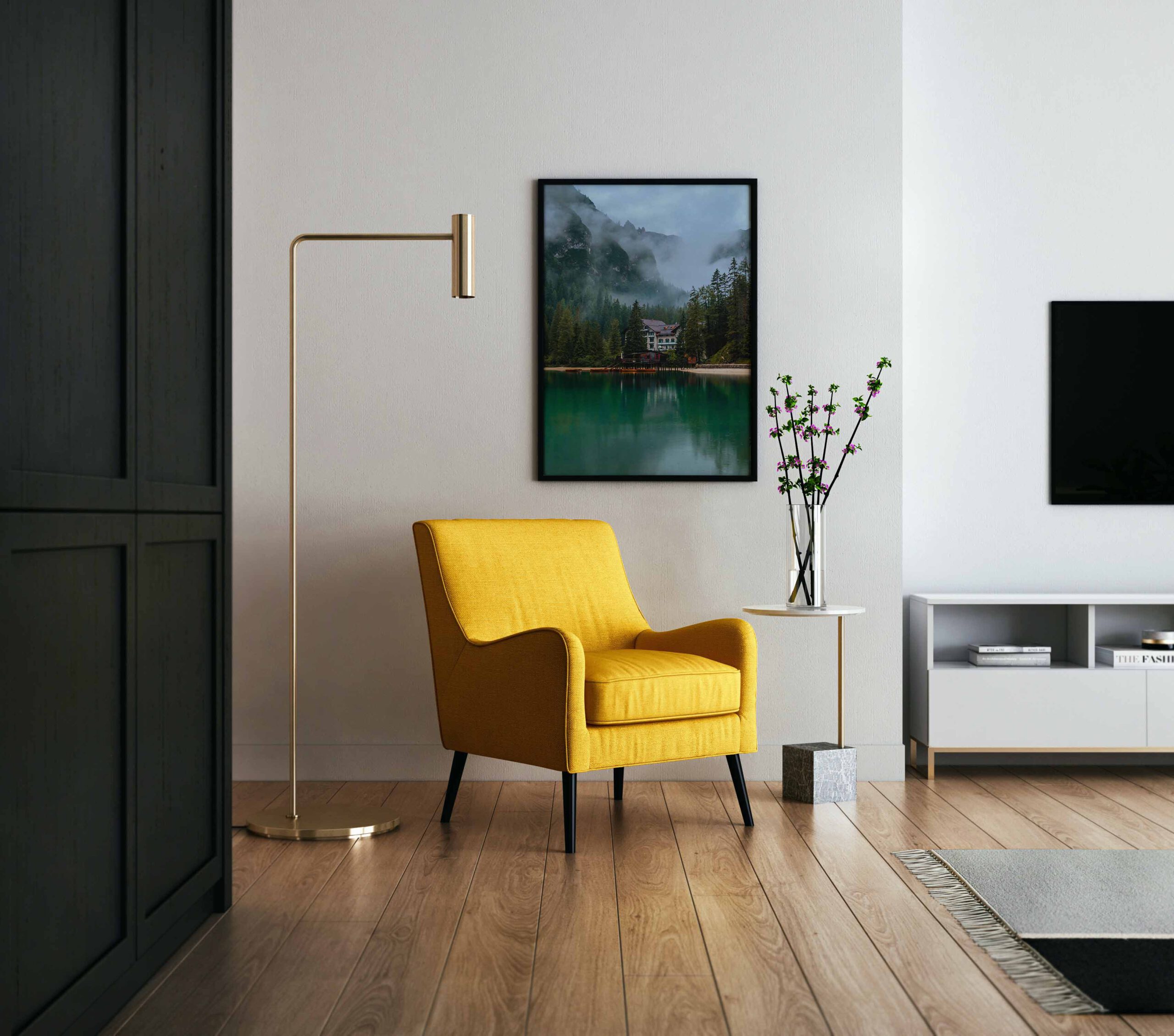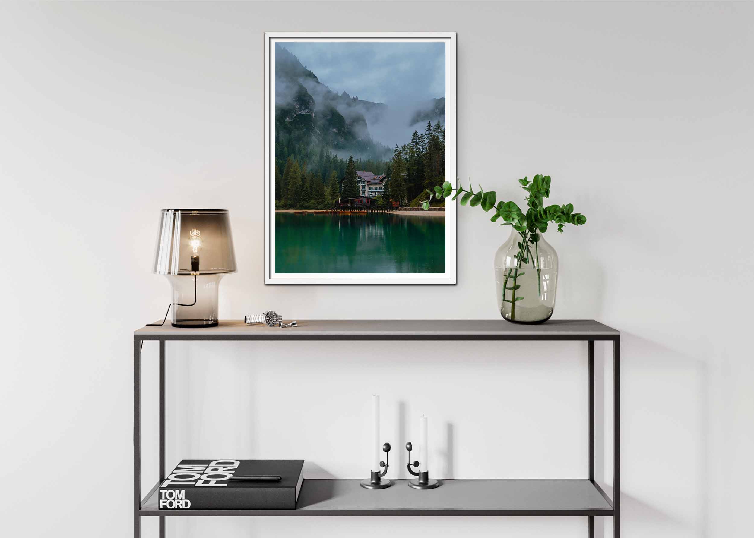 Bilden fångar en förtrollande vy av en lugn sjö omgiven av höga berg. En liten stuga med träfasad och röd tak ligger vid sjöns strand, delvis dold bakom höga barrträd. Sjöns vatten är kristallklart och speglar den omgivande naturen på ett magiskt sätt. Bergen i bakgrunden är täckta av ett tjockt molntäcke som ger bilden en mystisk och drömlik atmosfär. Ljuset är mjukt och diffust, vilket skapar en känsla av lugn och ro