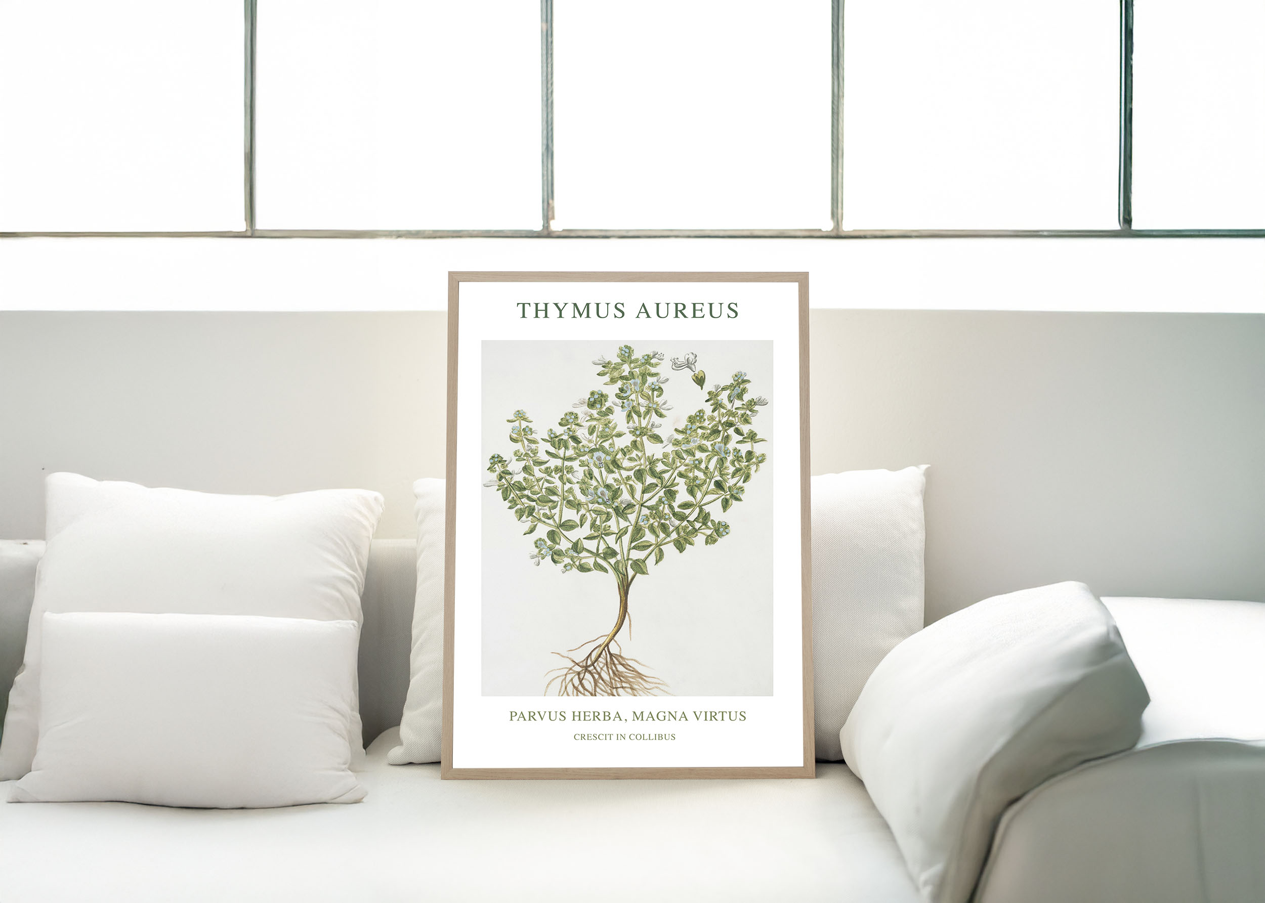 Mot en ljus, nästan vit bakgrund tronar en växt av gyllene timjan (Thymus aureus). Växten är avbildad i detalj, från dess rötter som slingrar sig neråt i jorden till de små, ovala bladen som täcker stjälkarna. Bladen har en mjuk, sammetslen yta och en vacker gulgrön färg. Uppemot stjälkarna sitter flera små, vita blommor samlade i täta klasar. Blommorna har en delikat struktur och ger ett intryck av lätthet. Ljuset faller mjukt över växten, vilket ger bilden en lugn och harmonisk känsla. Bilden har en klassisk och botanisk stil, som om den är hämtad ur en gammal herbarium.