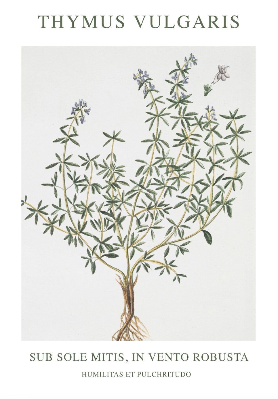 Mot en ljus, nästan vit bakgrund tronar en buskig växt av timjan (Thymus vulgaris). Växten är täckt av små, aromatiska blad och bär på flera upprätta stjälkar. Varje stjälk avslutas i en tät klase av små, lila blommor. Blommorna har en fjärilsliknande form och är arrangerade längs stjälken. Ljuset faller mjukt över växten, vilket ger bilden en lugn och harmonisk känsla. Bilden har en klassisk och botanisk stil, som om den är hämtad ur en gammal herbarium.
