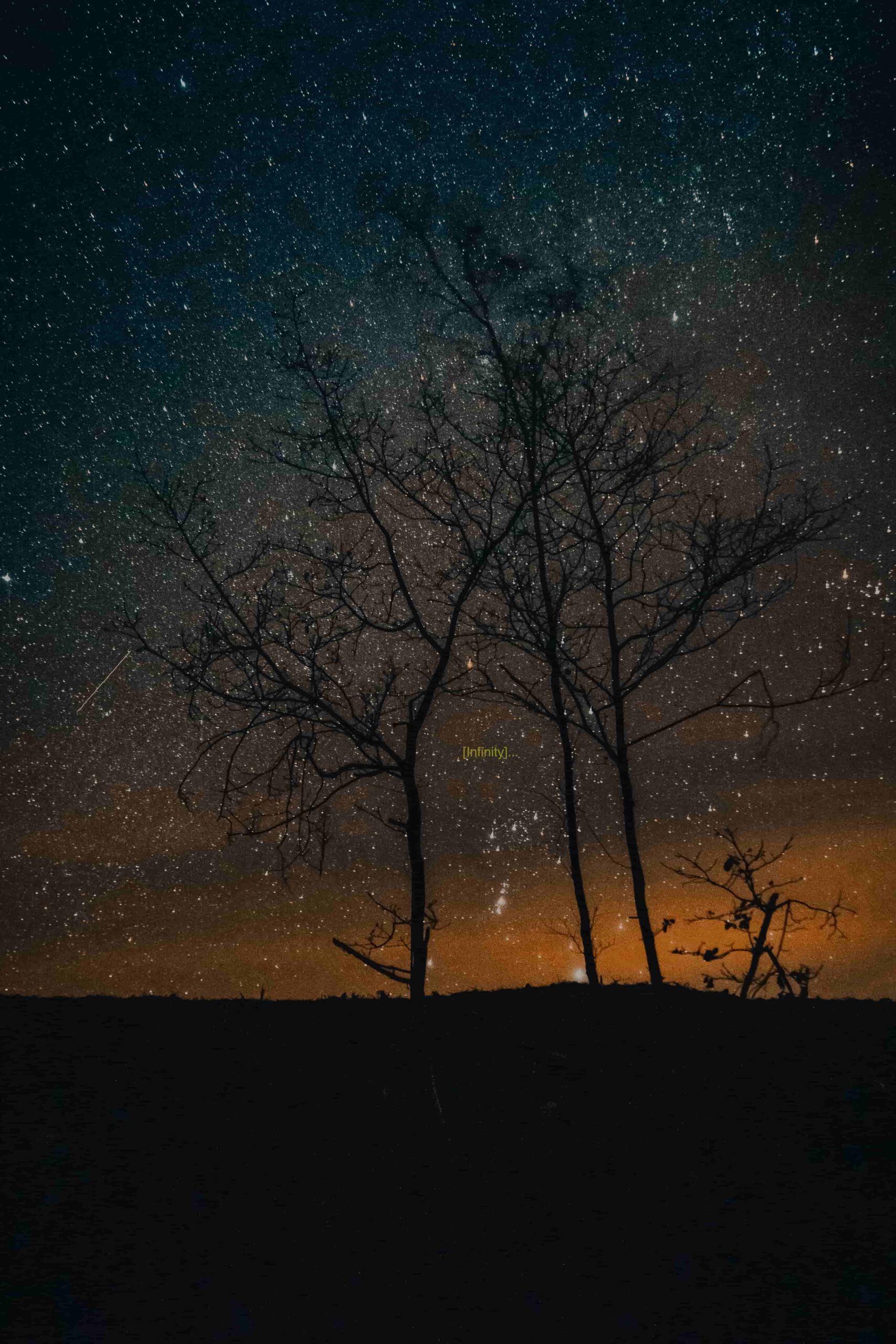 Mitt i denna stjärnprakt syns ett enkelt ord – “[Infinity…]” – skrivet i en subtil gul nyans, vilket ger bilden en filosofisk ton och uppmuntrar betraktaren att reflektera över universums gränslöshet. Kompositionen kombinerar trädet som en jordnära ankare med den oändliga himlen som en påminnelse om vår plats i kosmos. Den starka kontrasten mellan trädsiluetten och den upplysta natthimlen gör bilden till ett tankeväckande konstverk.