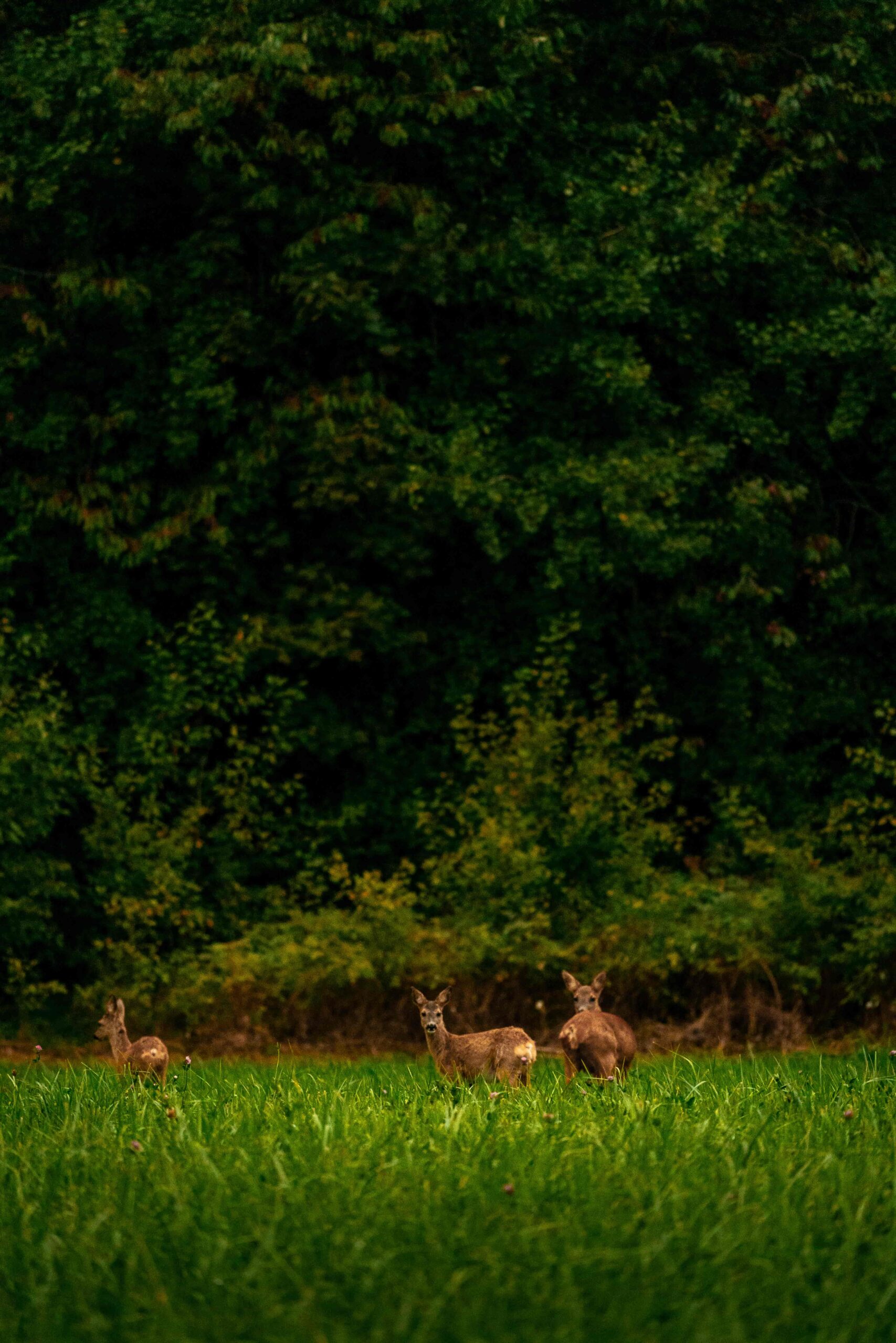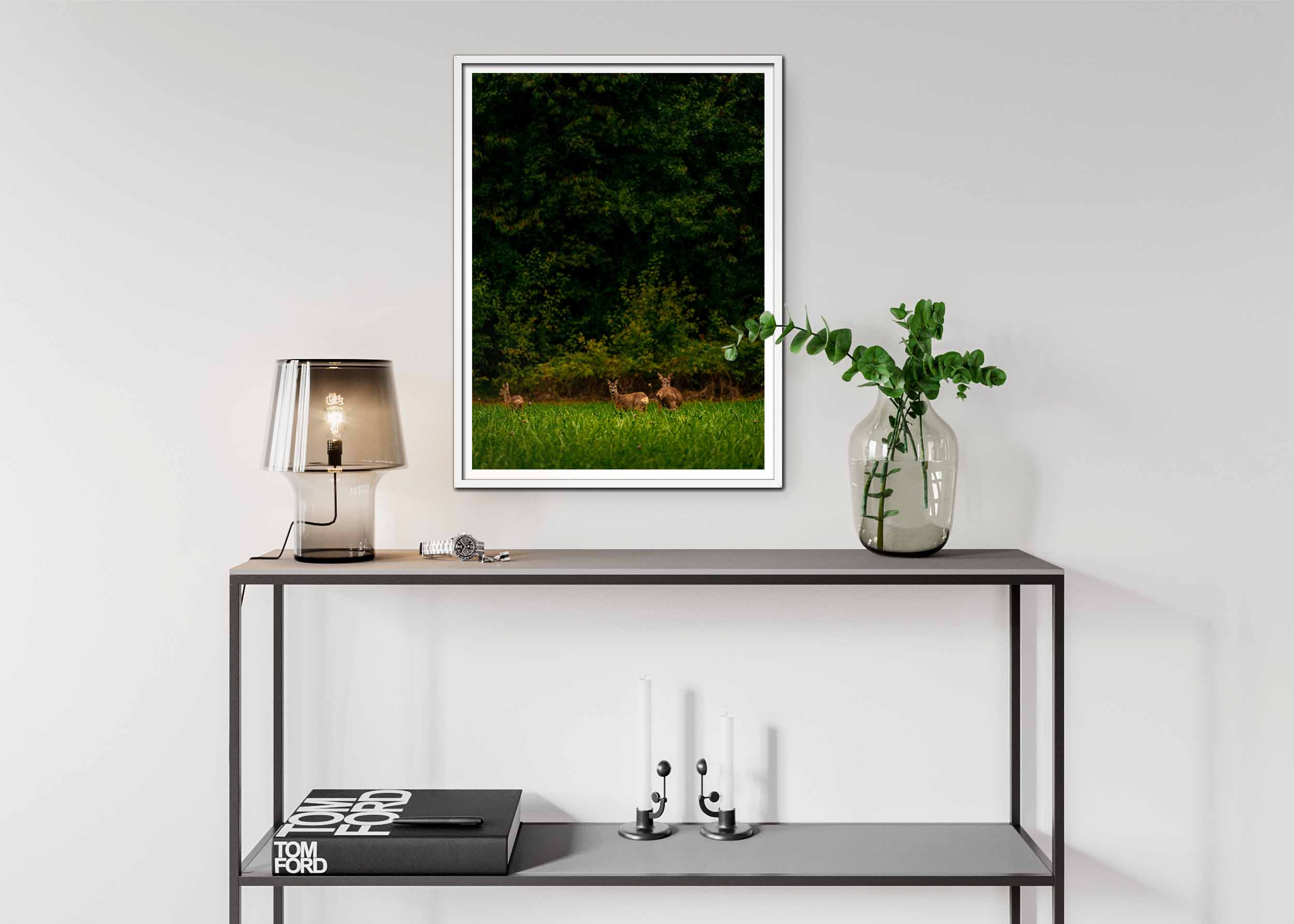 Den här postern visar en stillsam skogsscen en tidig sommarmorgon, där tre rådjur står i en grönskande glänta. De är placerade harmoniskt mitt i bilden, belysta av ett mjukt, gyllene ljus som silar genom lövverket och skapar ett varmt skimmer över deras pälsar. Två av rådjuren, en moder och hennes unge, står nära varandra med vakna, nyfikna blickar som riktas mot betraktaren. Deras hållning är stolt och elegant, vilket skapar en känsla av värdighet och stillhet. Bakom dem syns ett tredje rådjur som står i skuggorna, delvis dolt av högt gräs och blad. Detta rådjur nosar försiktigt i marken, vilket tillför en känsla av naturlig rörelse i bilden.