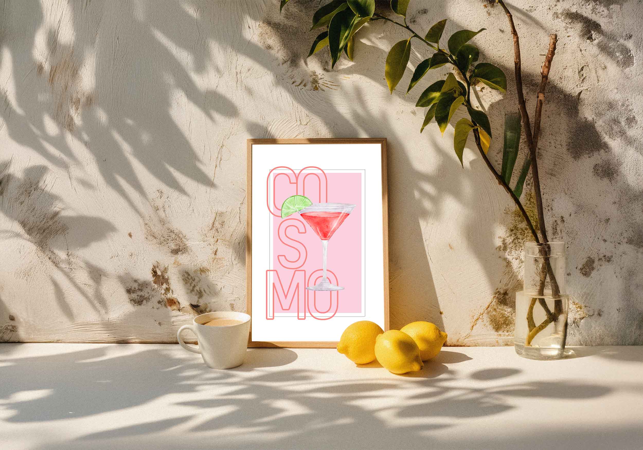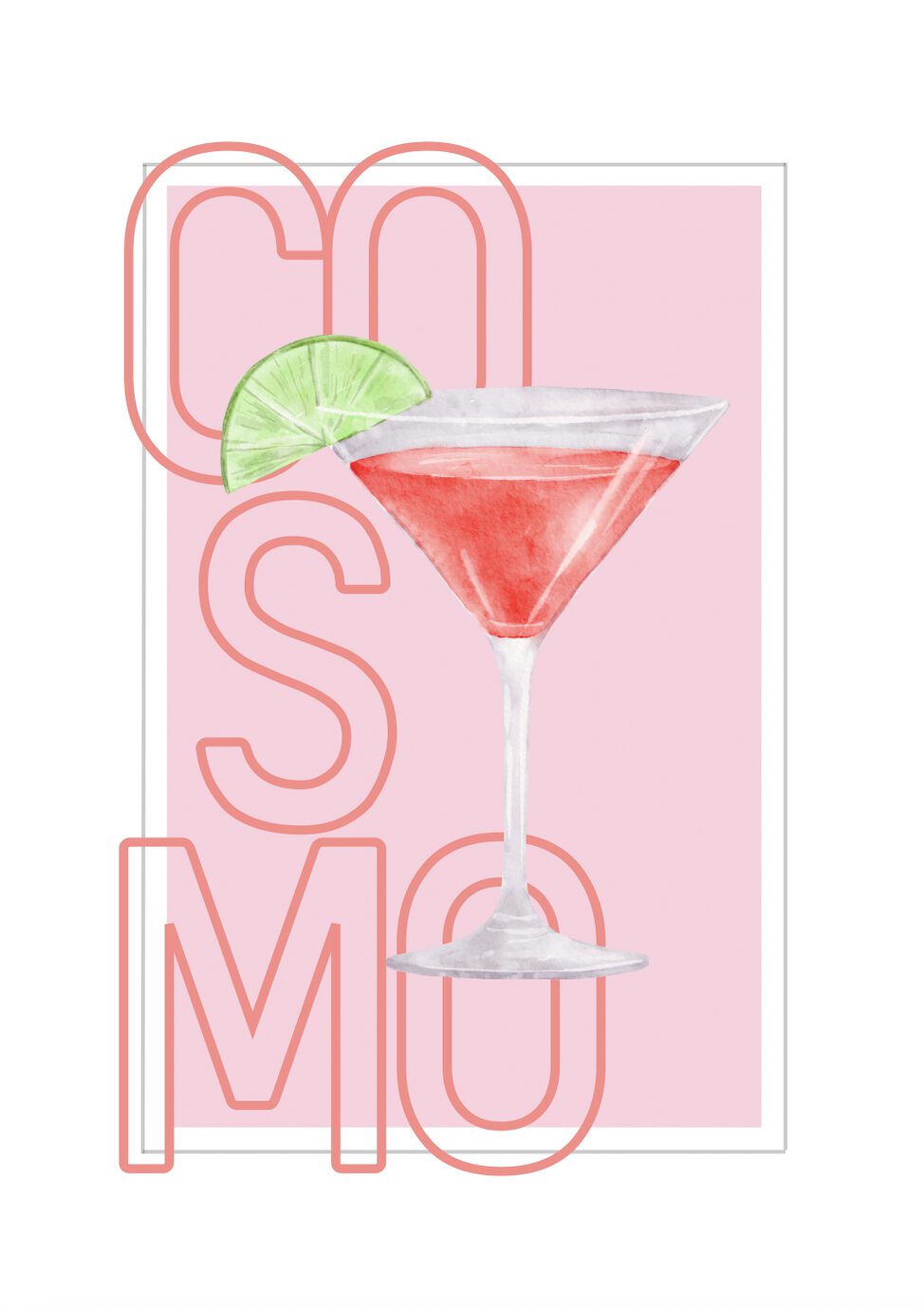 Denna poster är en modern och stilfull illustration av den klassiska drinken Cosmopolitan. I centrum står ett elegant martiniglas fyllt med en friskt rosa-röd cocktail, dekorerat med en saftig limeskiva på glaskanten. Glaset är avbildat i en mjuk akvarellstil som ger motivet en fräsch och levande känsla.