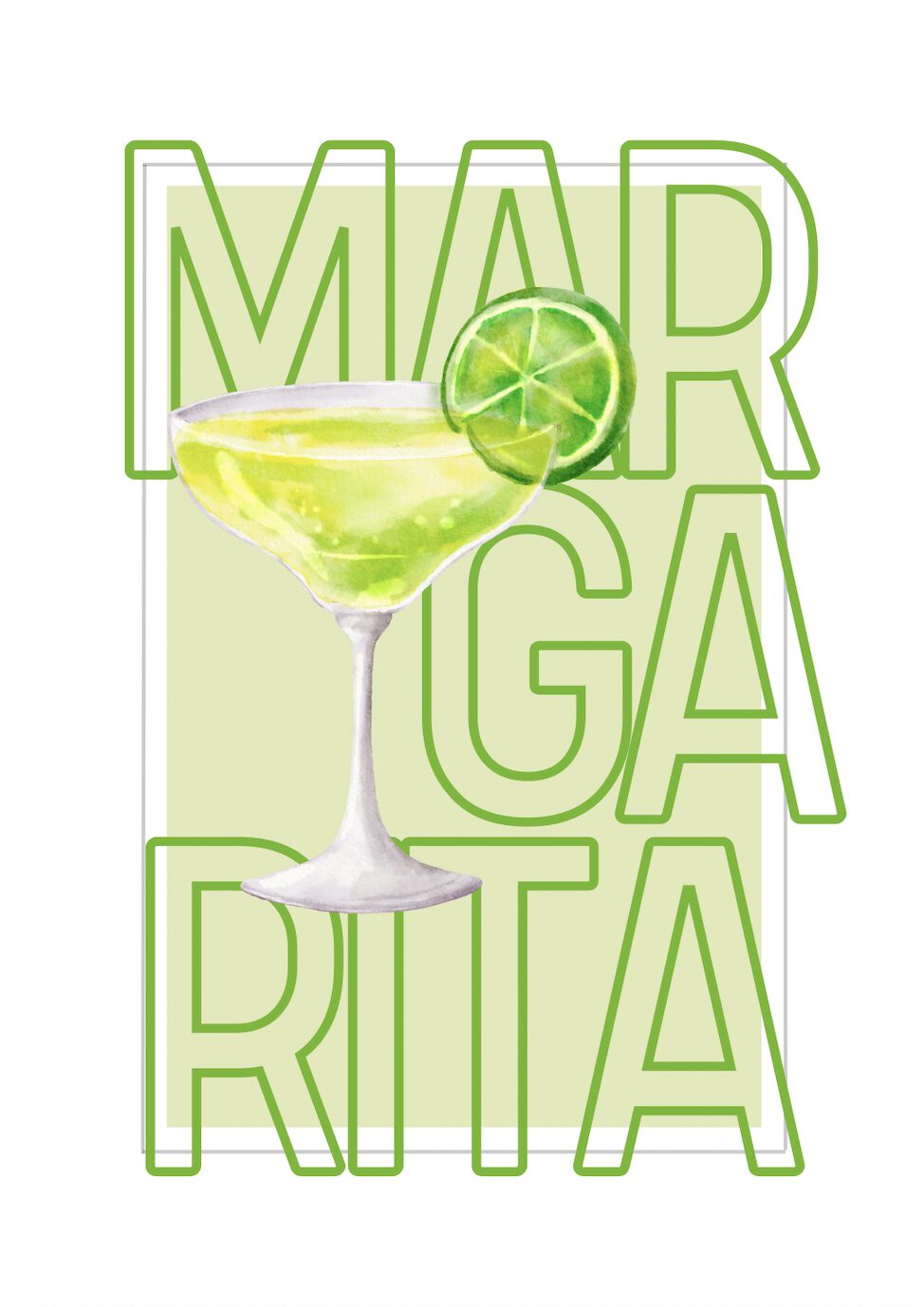 Denna poster är en livfull och modern illustration av den klassiska drinken Margarita. I centrum står ett elegant margaritaglas fyllt med den friskt limegröna cocktailen, toppad med en dekorativ limeskiva på kanten. Glasets mjuka former kontrasteras snyggt mot den grafiska bakgrunden, där ordet MARGARITA är utskrivet i stora gröna bokstäver och sträcker sig över hela motivet.
