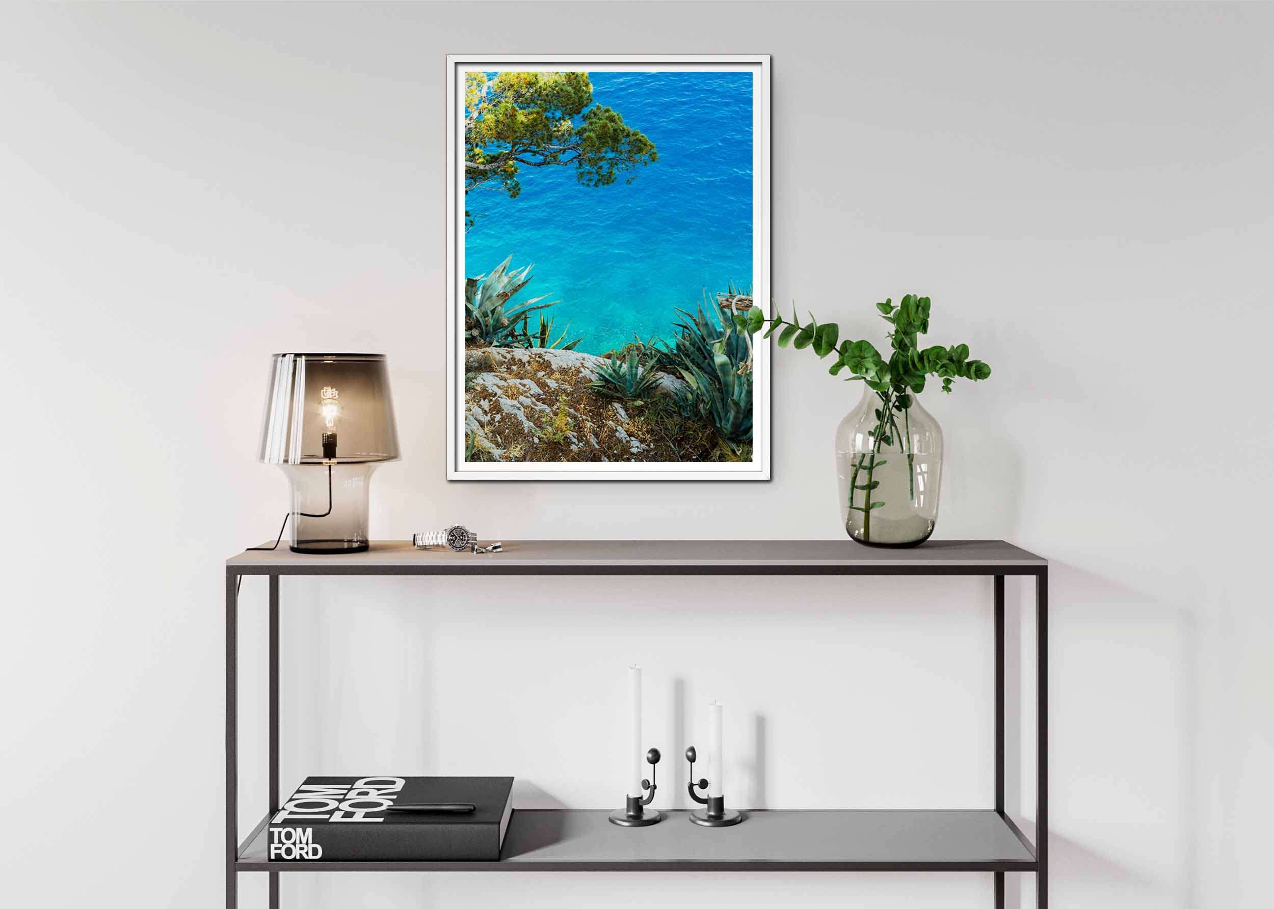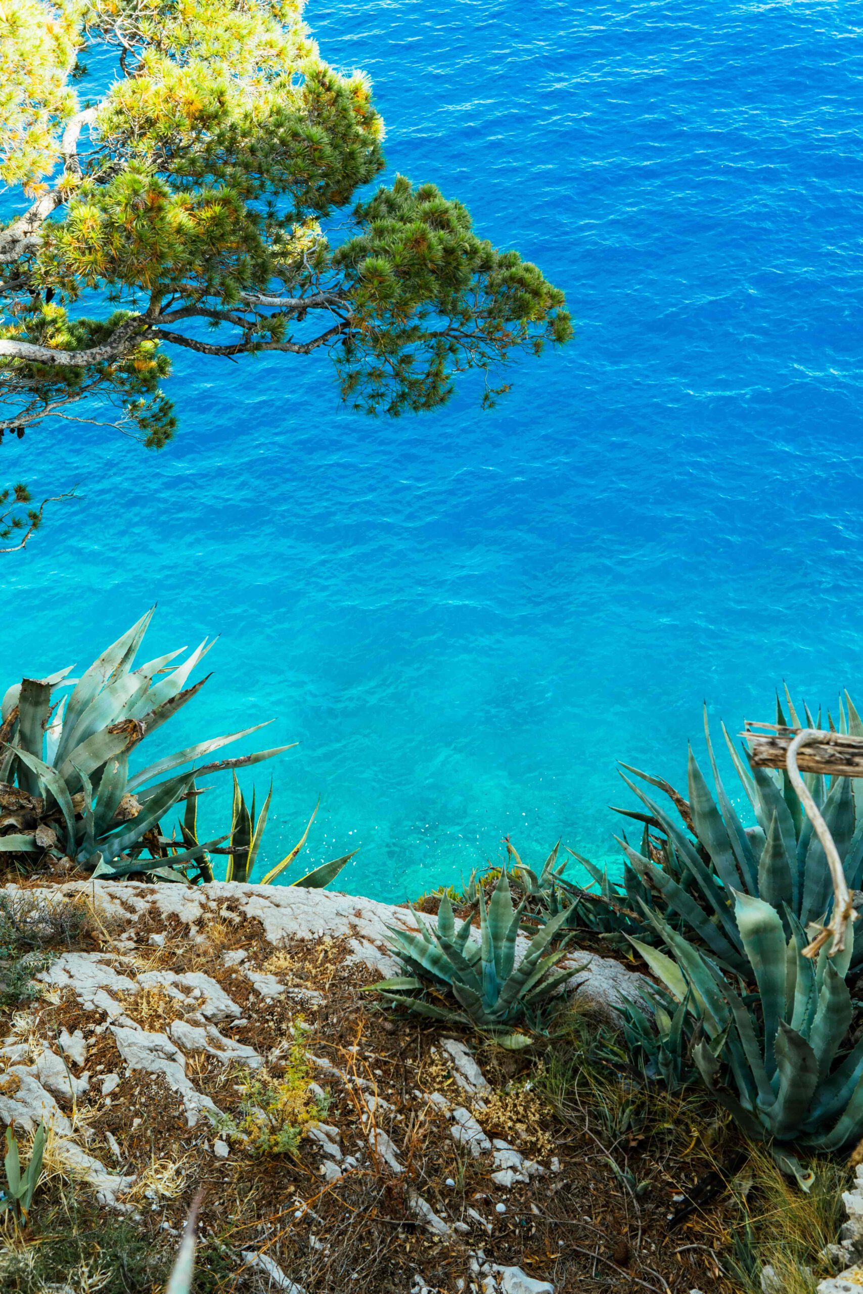 Bilden fångar ett ögonblick av ren skärgårdsidyll. Från en upphöjd position blickar vi ut över ett kristallklart, turkost hav som sträcker sig mot en oändlig horisont. Det glittrande vattnet inbjuder till bad och avkoppling. I förgrunden ramar ett robust klipputsprång in scenen. Klipporna är täckta av sparsam vegetation, med kraftiga agaveplantor som kämpar för att få fäste i det karga landskapet. Ett ensamt tall träd sträcker sina grenar mot himlen, dess gröna barr som står i stark kontrast mot det blå havet. Ljuset faller mjukt över landskapet, skapande en känsla av lugn och harmoni.