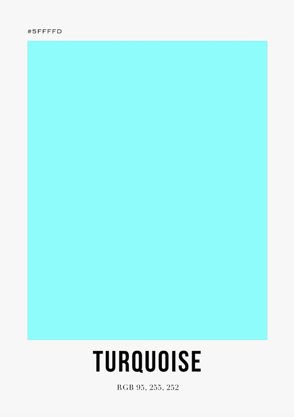 Bilden är en enkel, men effektfull representation av färgen turkos. Den består av en stor, kvadratisk yta fylld med en intensiv turkos färg, definierad av hex-koden #5FFFFD. Den turkosa färgen är ljus, klar och livfull, och fyller hela bilden. Längst ned på bilden finns ordet ”TURQUOISE” skrivet i svart, fet stil, tillsammans med RGB-värdena för färgen. Bakgrunden är helt vit, vilket skapar en skarp kontrast till den turkosa färgen och gör den till bildens absoluta fokus.