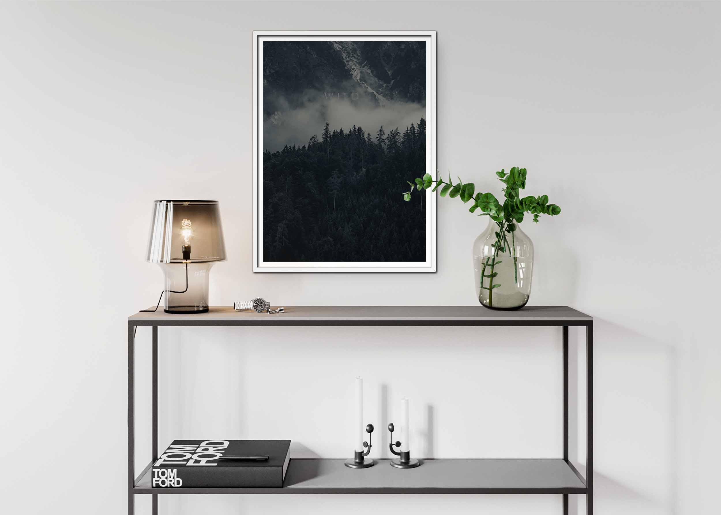 Bilden fångar en dramatisk vy av ett bergigt landskap, höljt i ett mystiskt dimslöja. Berget reser sig majestätiskt i bakgrunden, dess topp delvis dold av de tjocka molnen. En kaskad av vatten faller nerför bergets sida, vilket skapar en känsla av rå kraft och oändlighet. I förgrunden står en tät skog av mörka barrträd, som tycks försvinna in i dimman. Ordet ”WILD” är skrivet i versaler och placerat mitt i bilden, skymd av dimman, vilket förstärker känslan av vildmark och otillgänglighet. Bilden utstrålar en känsla av både skönhet och vildhet, och inbjuder betraktaren att utforska det okända.