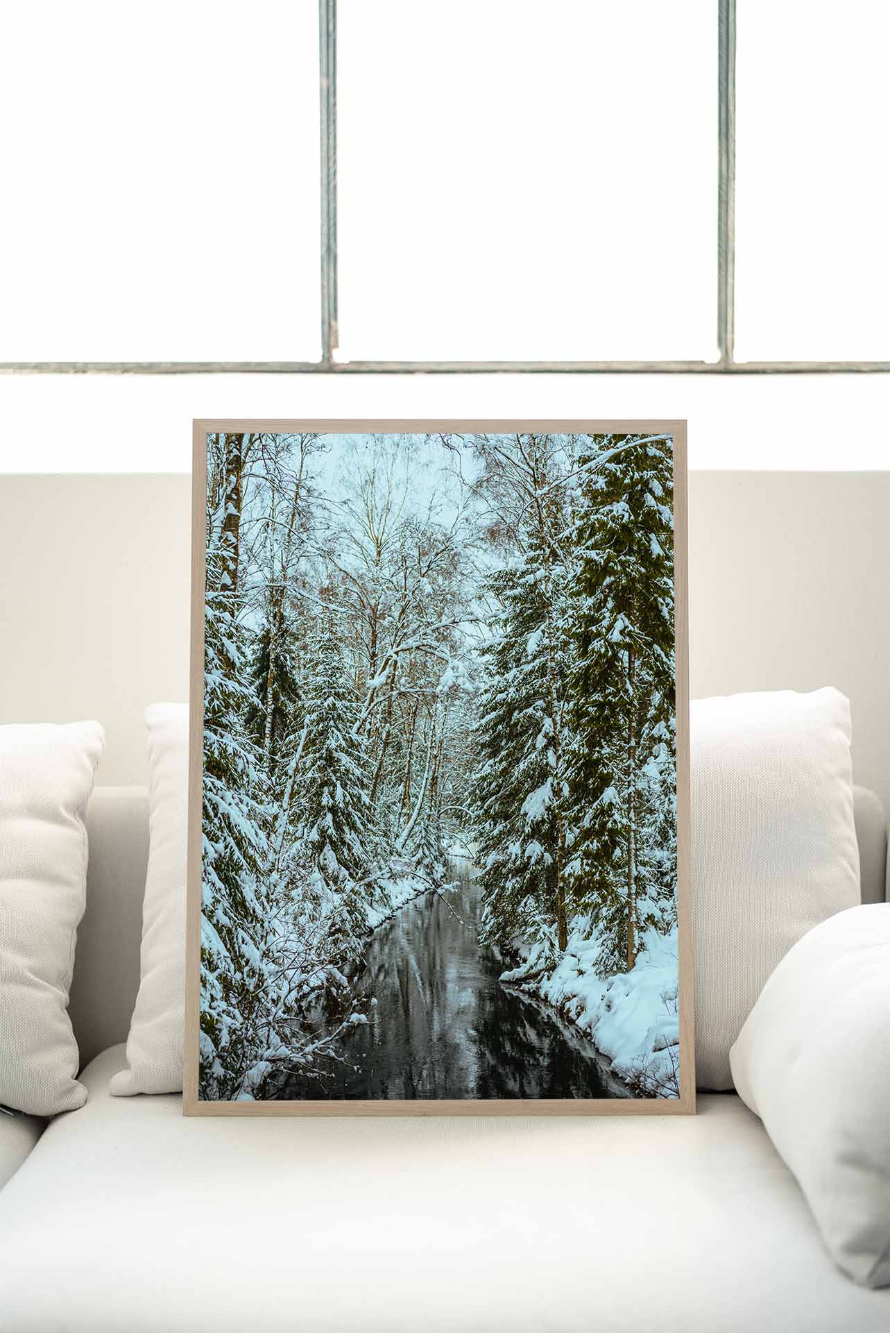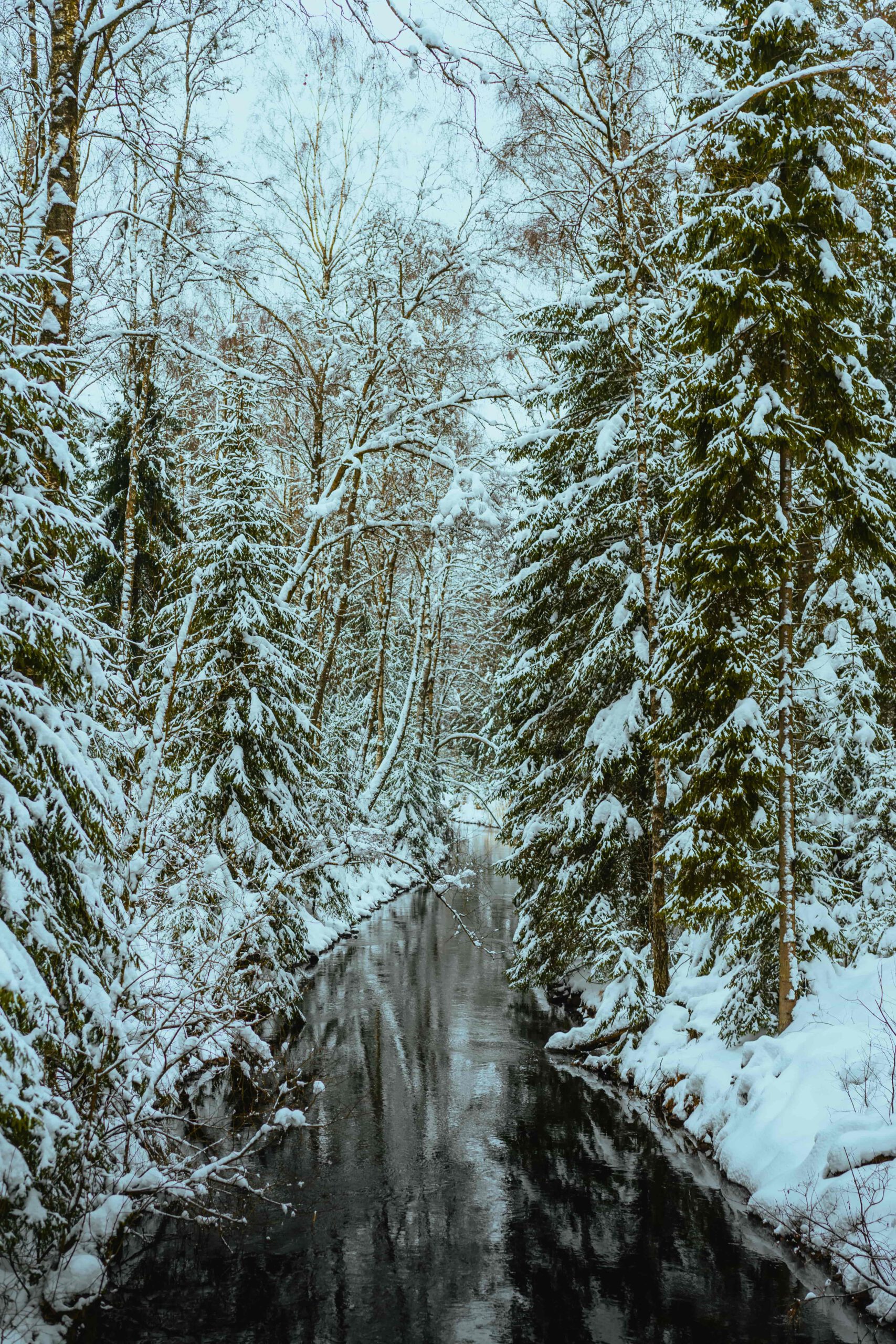 Bilden fångar en förtrollande vinterdag i en skog där en liten bäck slingrar sig fram. Träden på båda sidor av bäcken är klädda i ett täcke av snö, som glittrar i det svaga vinterljuset. De kala grenarna på lövträden skapar ett spännande mönster mot den mörkare gröna färgen på de vintergröna träden. Bäckens vatten är mörkt och speglar träden och himlen i sin yta, vilket skapar en känsla av djup och lugn. Snön på marken är orörd och inbjuder till en tyst promenad.