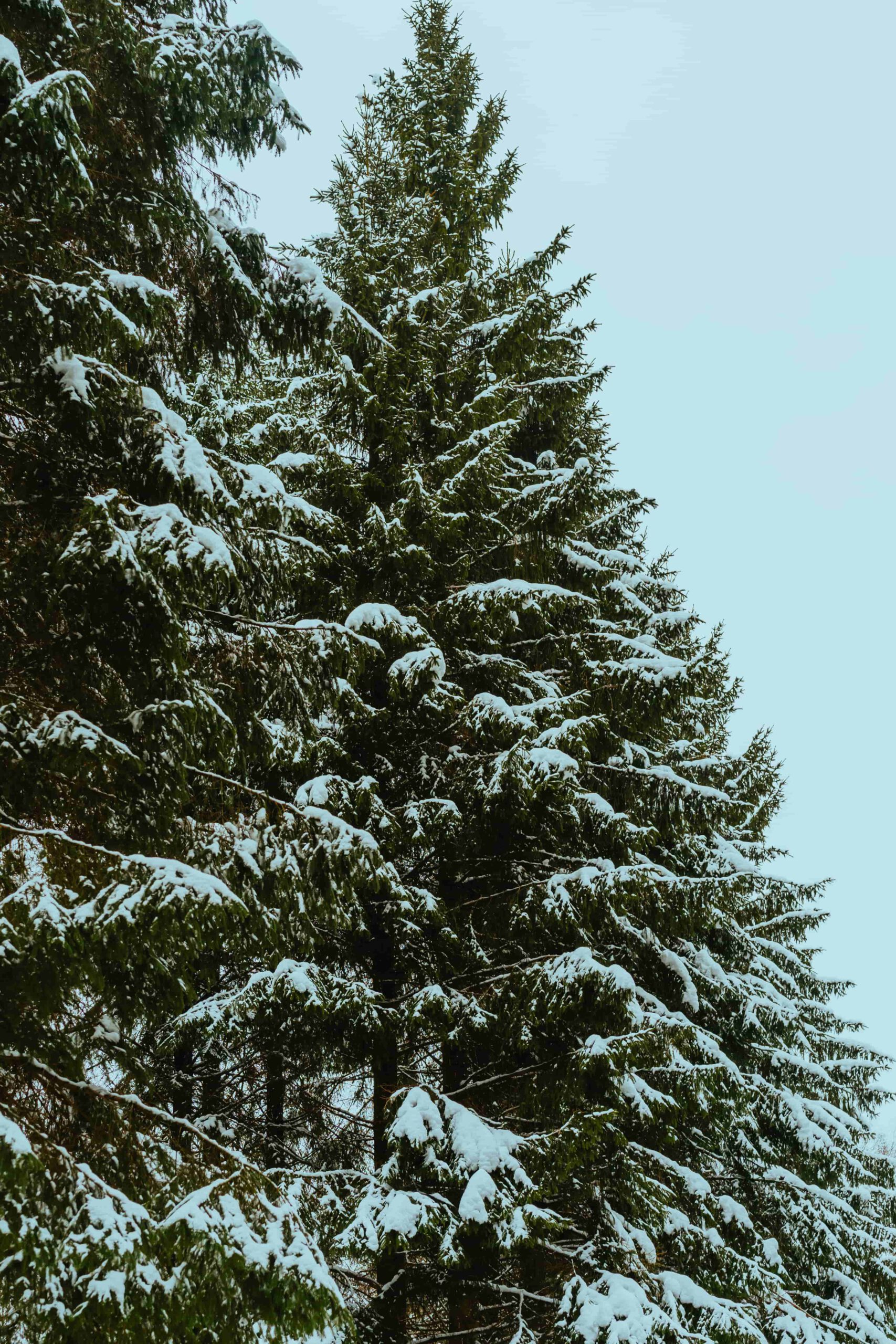 Bilden fångar ett förtrollande vinterlandskap där snötyngda granar sträcker sig mot en disig himmel. De mörkgröna barren står i stark kontrast mot den vita snön som täcker grenarna och marken. Granarnas spetsiga toppar pekar mot himlen och skapar en känsla av oändlighet. Ljuset filtreras genom trädkronorna och skapar ett mjukt, diffust sken som ger bilden en nästan drömlik kvalitet. Det finns en känsla av lugn och stillhet i bilden, som om tiden står stilla i denna förtrollade skog.