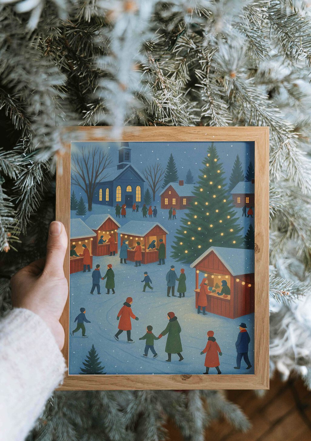 En blå skymning faller över en liten stad där snön virvlar mjukt. På kyrkbacken lyser fönstren varmt och framför den vita kyrkspiran breder en julmarknad ut sig. Röda träbodar kantas av gyllene ljusslingor, där försäljare räcker över stickade vantar, karameller och små hantverk. Mitt på torget står en hög gran, tät och mörkgrön, med jämnt spridda guldfärgade lampor som speglar sig i det hårda snöunderlaget. Familjer promenerar hand i hand, barn springer lekfullt i slingrande spår och samtal blandas med klingande skratt. Färgskalan i mjuka akvarelltoner – dämpat blått, granitgrönt och falurött – ger motivet en tidlös, nordisk julkänsla. Postern gör sig särskilt vacker i vardagsrum, kök eller hall, där den skapar varm marknadsstämning hela vintern.