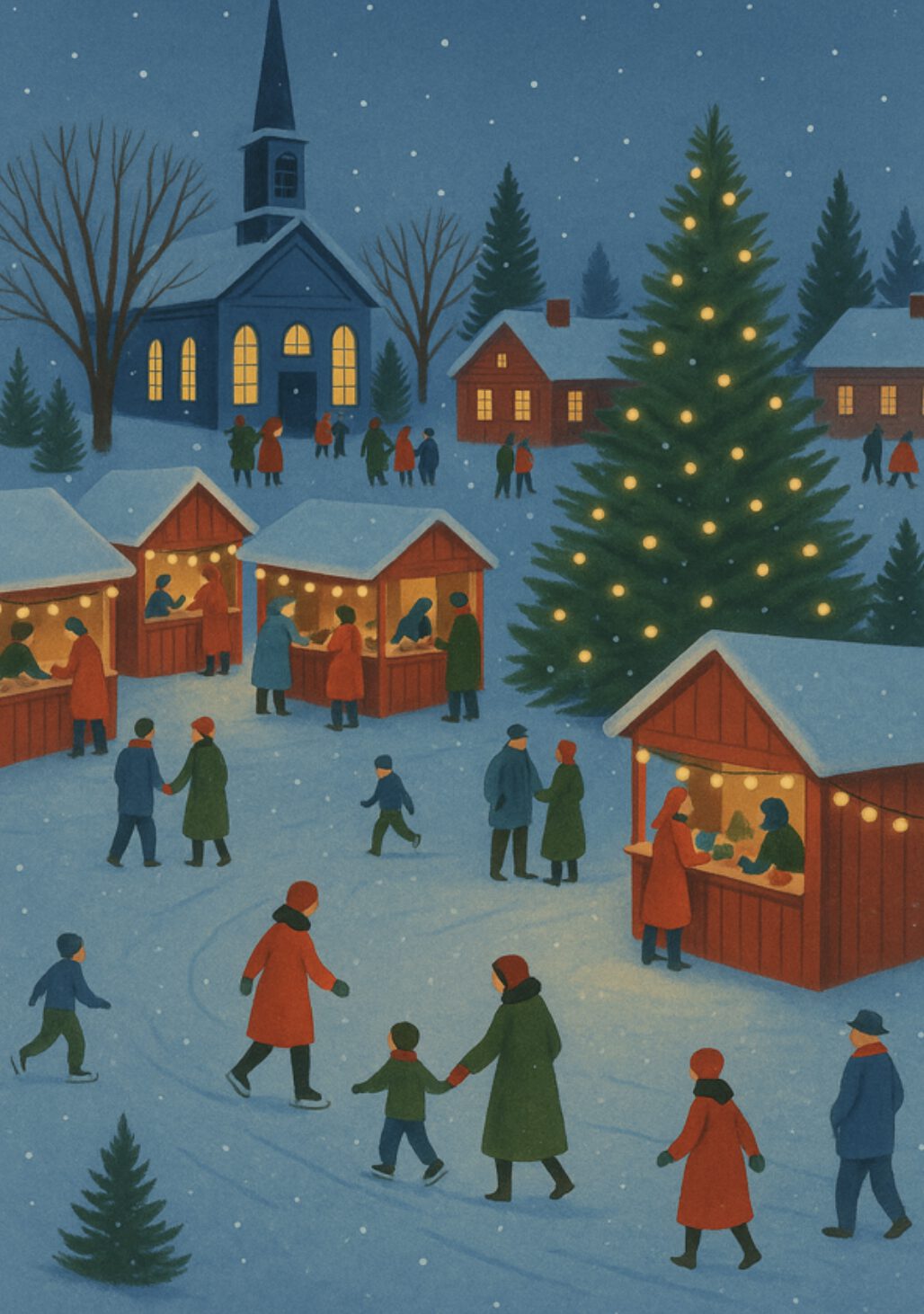 En blå skymning faller över en liten stad där snön virvlar mjukt. På kyrkbacken lyser fönstren varmt och framför den vita kyrkspiran breder en julmarknad ut sig. Röda träbodar kantas av gyllene ljusslingor, där försäljare räcker över stickade vantar, karameller och små hantverk. Mitt på torget står en hög gran, tät och mörkgrön, med jämnt spridda guldfärgade lampor som speglar sig i det hårda snöunderlaget.
