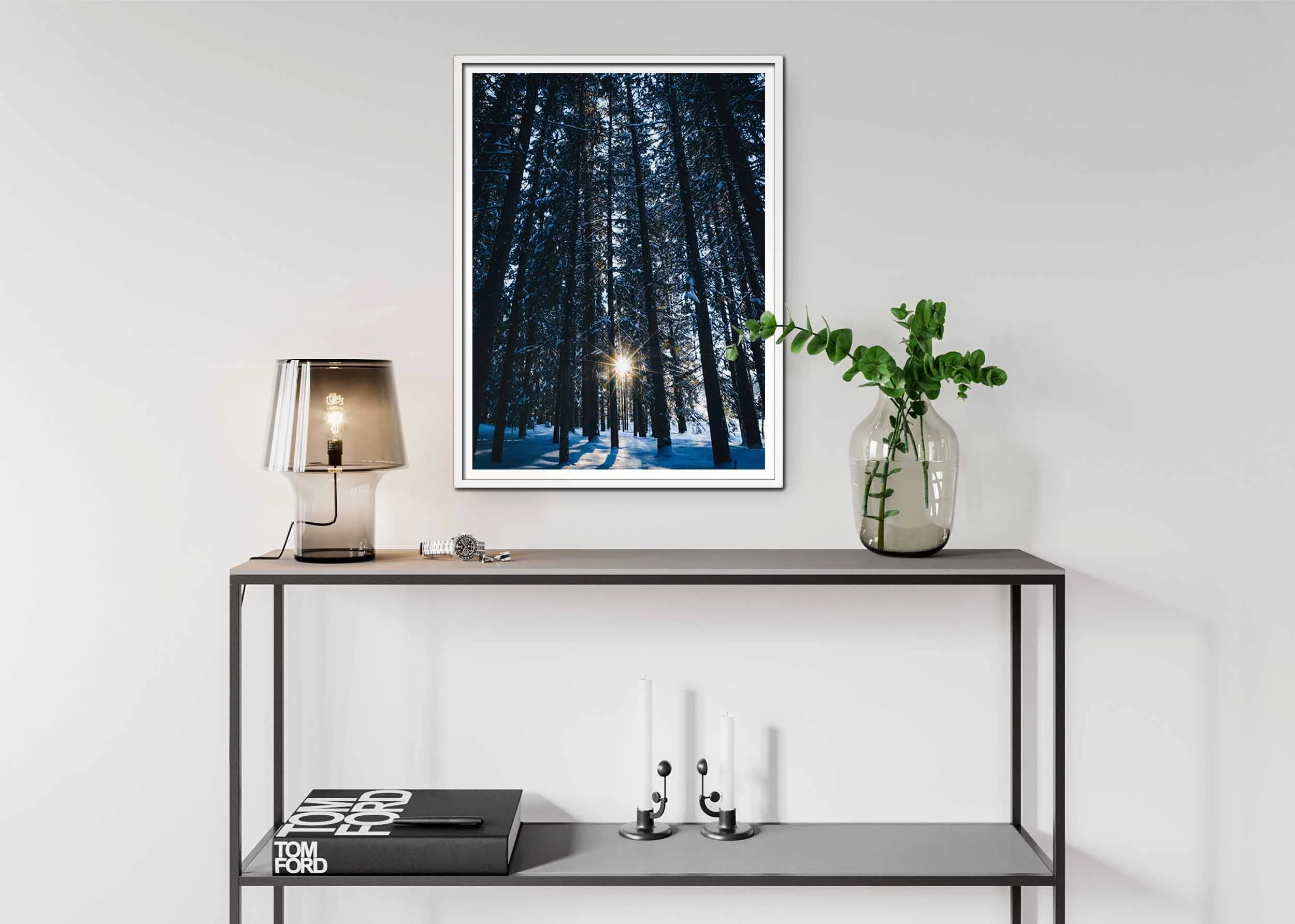 Denna bild föreställer en stämningsfull vinterskog där solens strålar bryter genom de höga granarna och skapar ett gyllene sken som sprider sig över snötäcket. Trädens silhuetter framträder mörka mot den ljusblå himlen, och grenarna är täckta av ett tunt lager snö som skimrar i det mjuka solljuset. Solens strålar, fångade precis när de når marken, kastar långa, skarpa skuggor över den orörda snön. Bildens kalla ton skapar en lugn och nästan magisk atmosfär, som om man befinner sig i ett sagoskogslandskap, stilla och fridfullt.